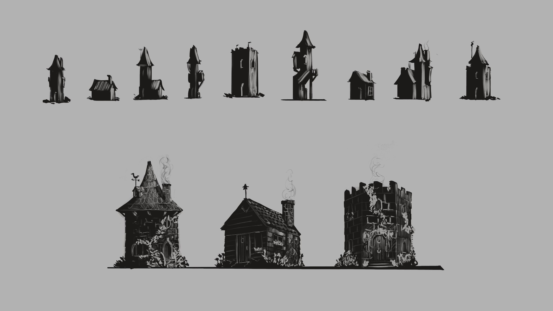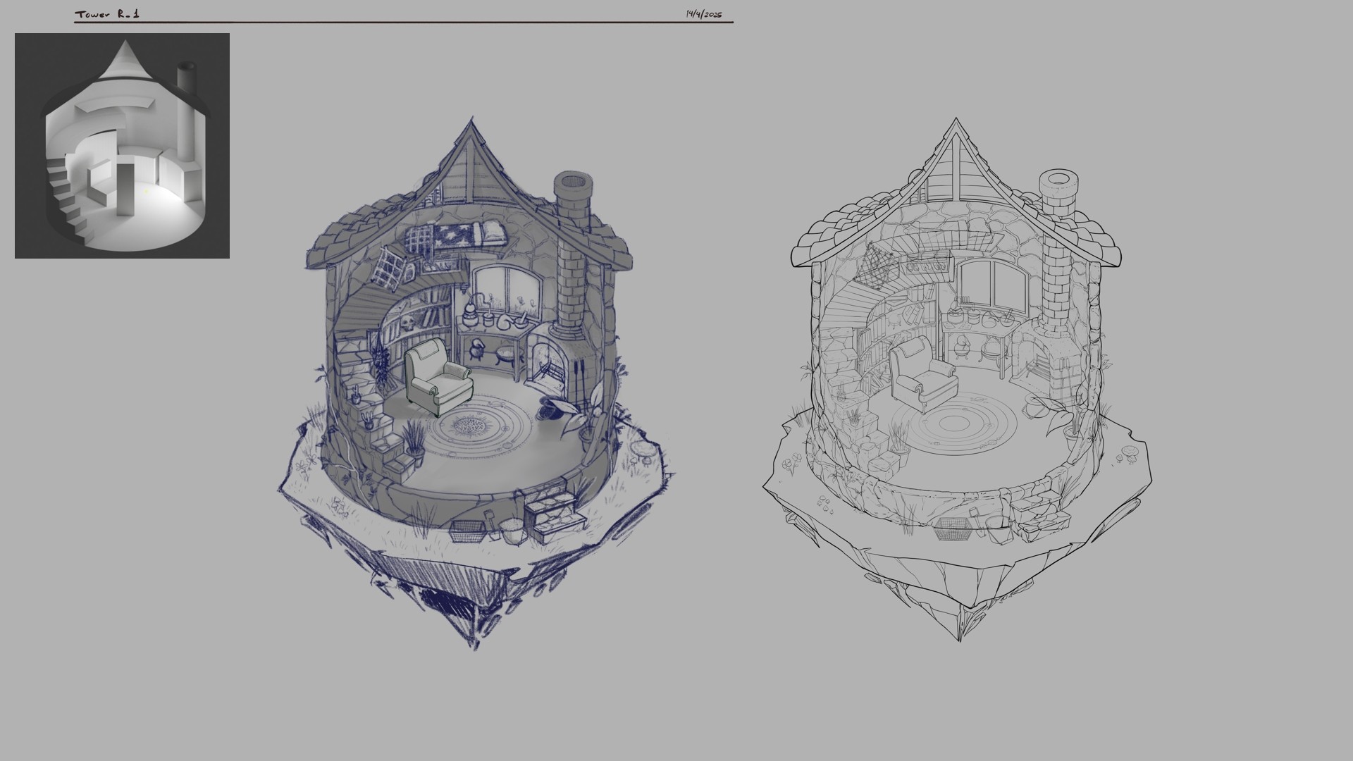 Following an initial silhouette exploration, a circular structure with a pointed roof was selected to evoke a friendly yet reclusive wizard archetype. The main challenge was mapping the interior (library, kitchen, and fireplace) within a 3/4 top-down perspective. To resolve the circular floor plan and staircase, I developed a 3D lighting study in Blender to accurately calculate how the fireplace illumination would interact with the small, cozy interior.